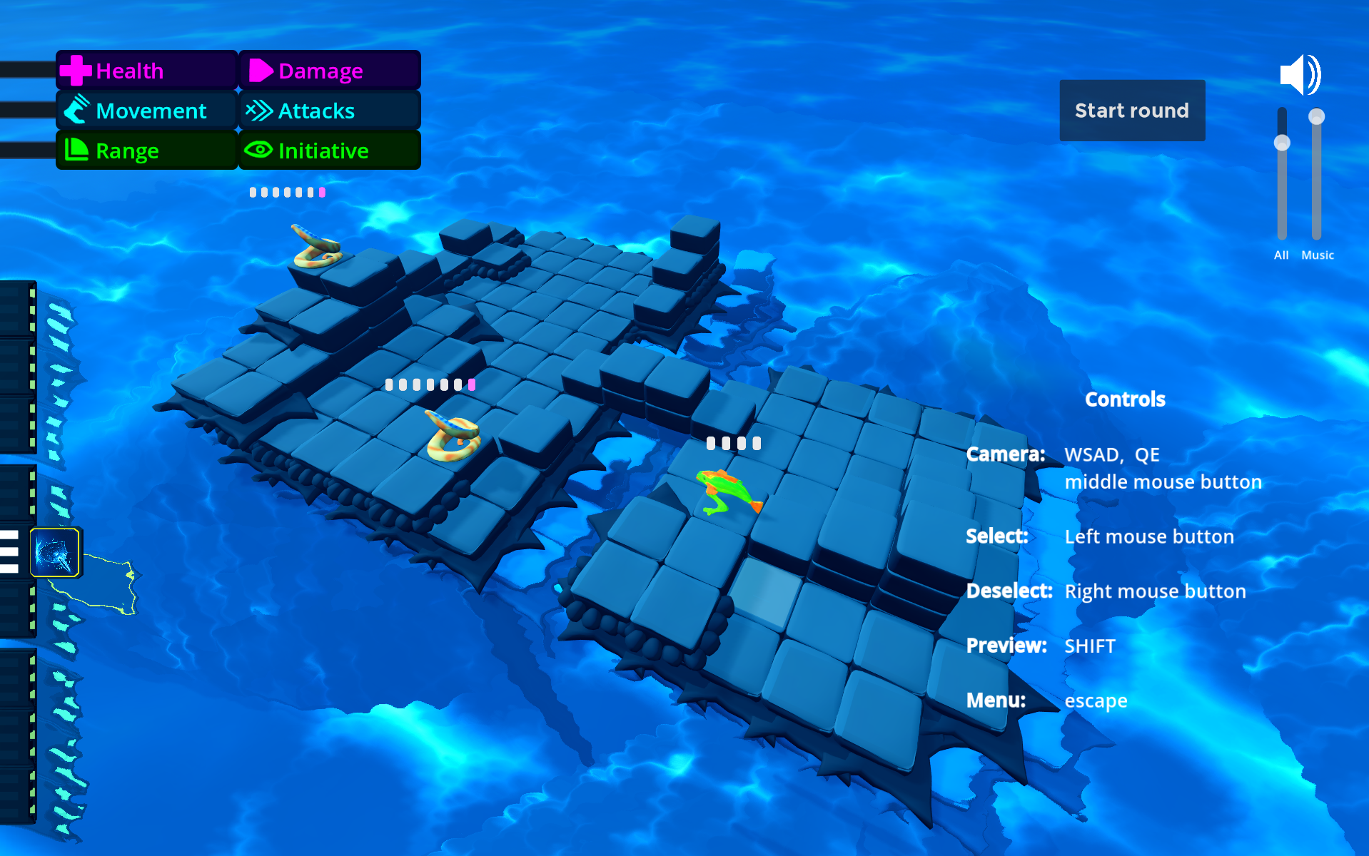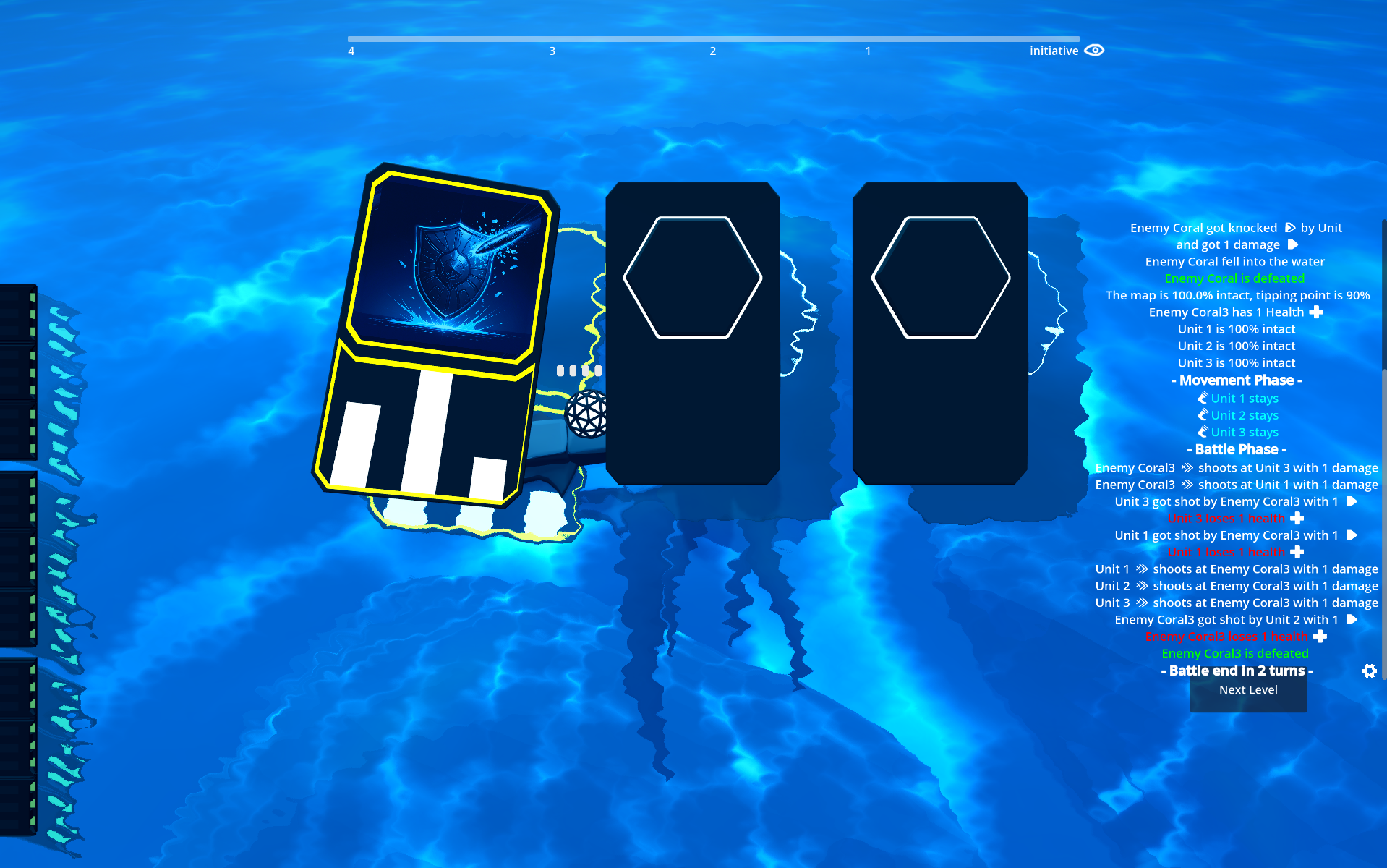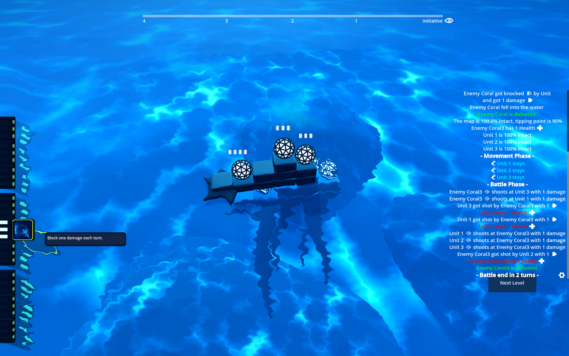 Gameplay: skill your units by selecting them and turn the wheels handles. Select a movement path for your units, press End Turn and watch the battle unfold.